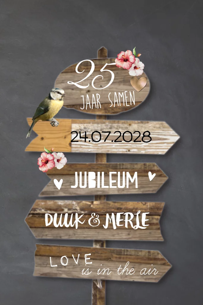 Uitnodiging 25 jaar getrouwd krijtbord met houten bord en vogel. (3287)