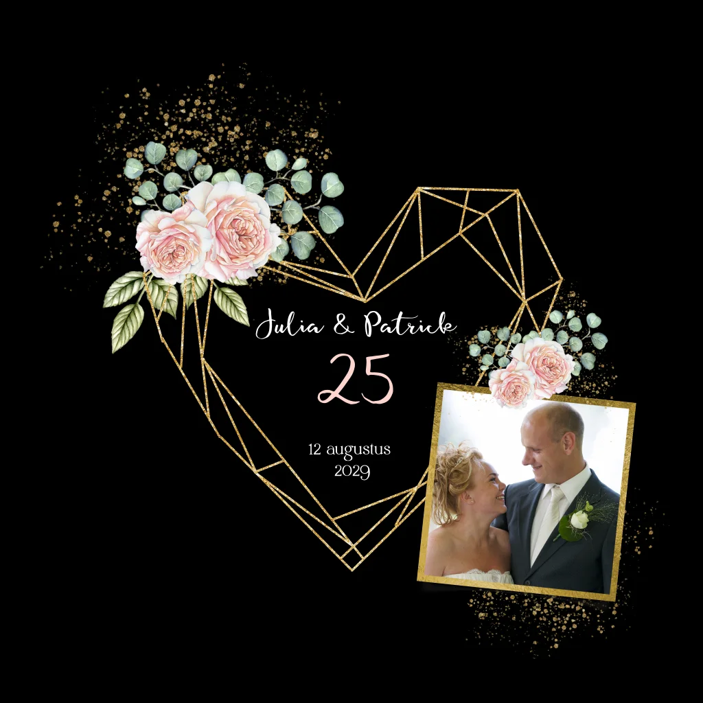 Uitnodiging 25 jaar getrouwd met mooie botanische rozen op een hart van goud glitter frame. (10156)