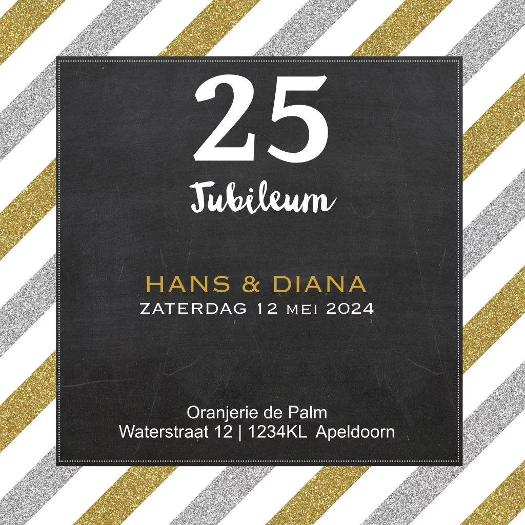 Enkelzijdige jubileumkaart 25 met goud look en zilver look streep en krijtbord. (6340)