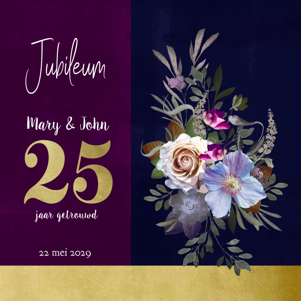 Sfeervolle uitnodiging 25 jaar getrouwd in paars blauwe tinten met goudkleurige details. Rozen en een anemoon en binnen een mooi kader voor je eigen foto. (21429)