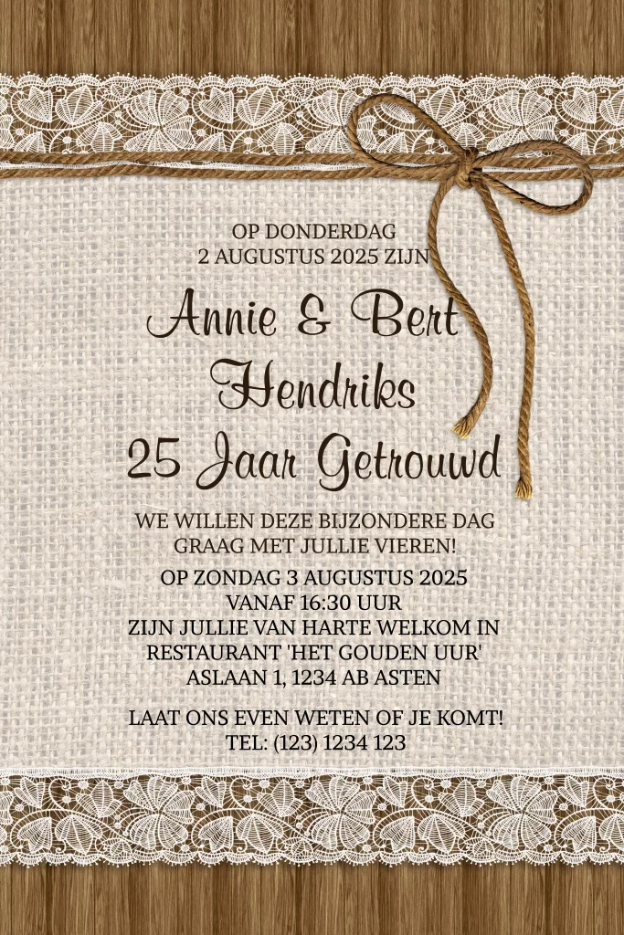 Rustieke jubileumuitnodiging 25 jaar met hout kant en jute