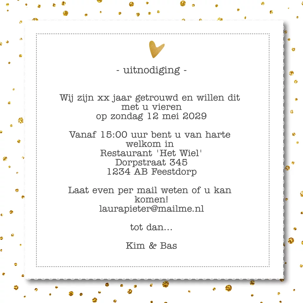 Super leuke uitnodiging 25 jaar getrouwd met goudkleurige spetters en hartjes. (3295)