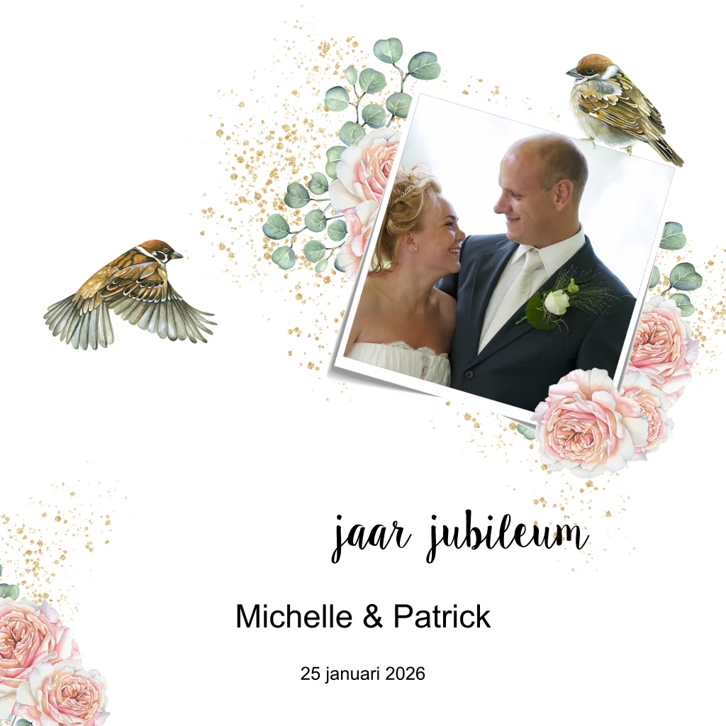 Uitnodiging 25 jaar getrouwd met mooie botanische rozen en lieve mussen vogeltjes. (10155)