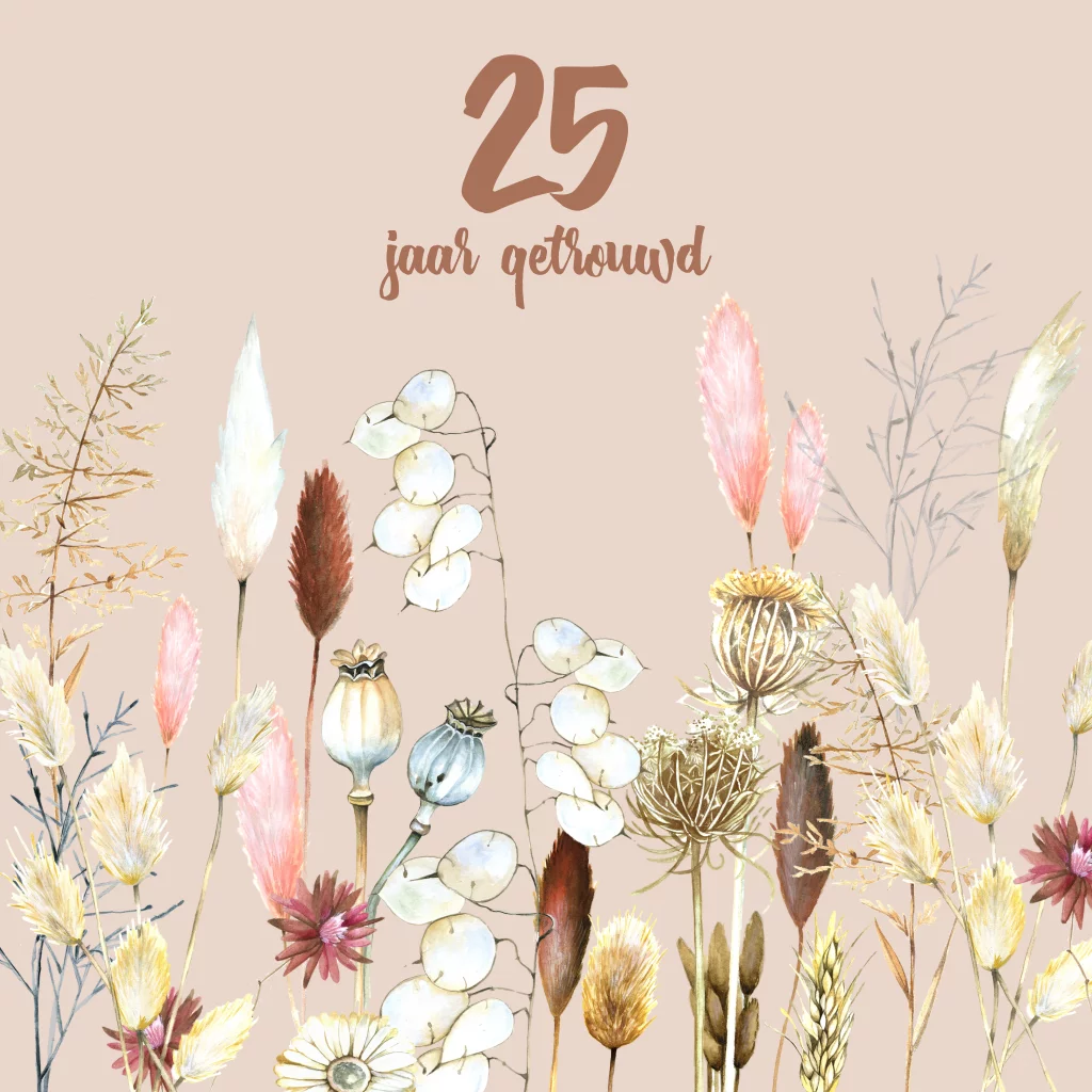 Uitnodiging 25 jaar getrouwd met mooi getekende droogbloemen en pampagras. (20462)