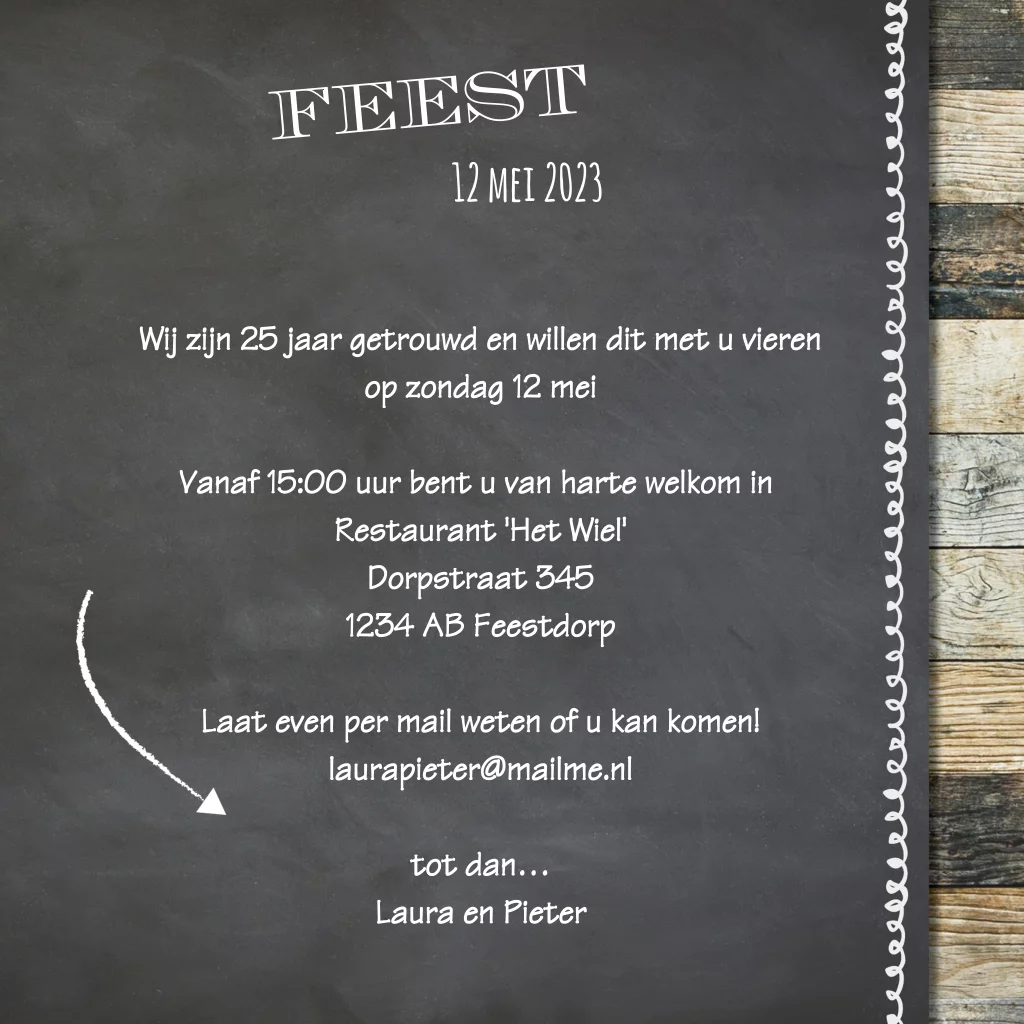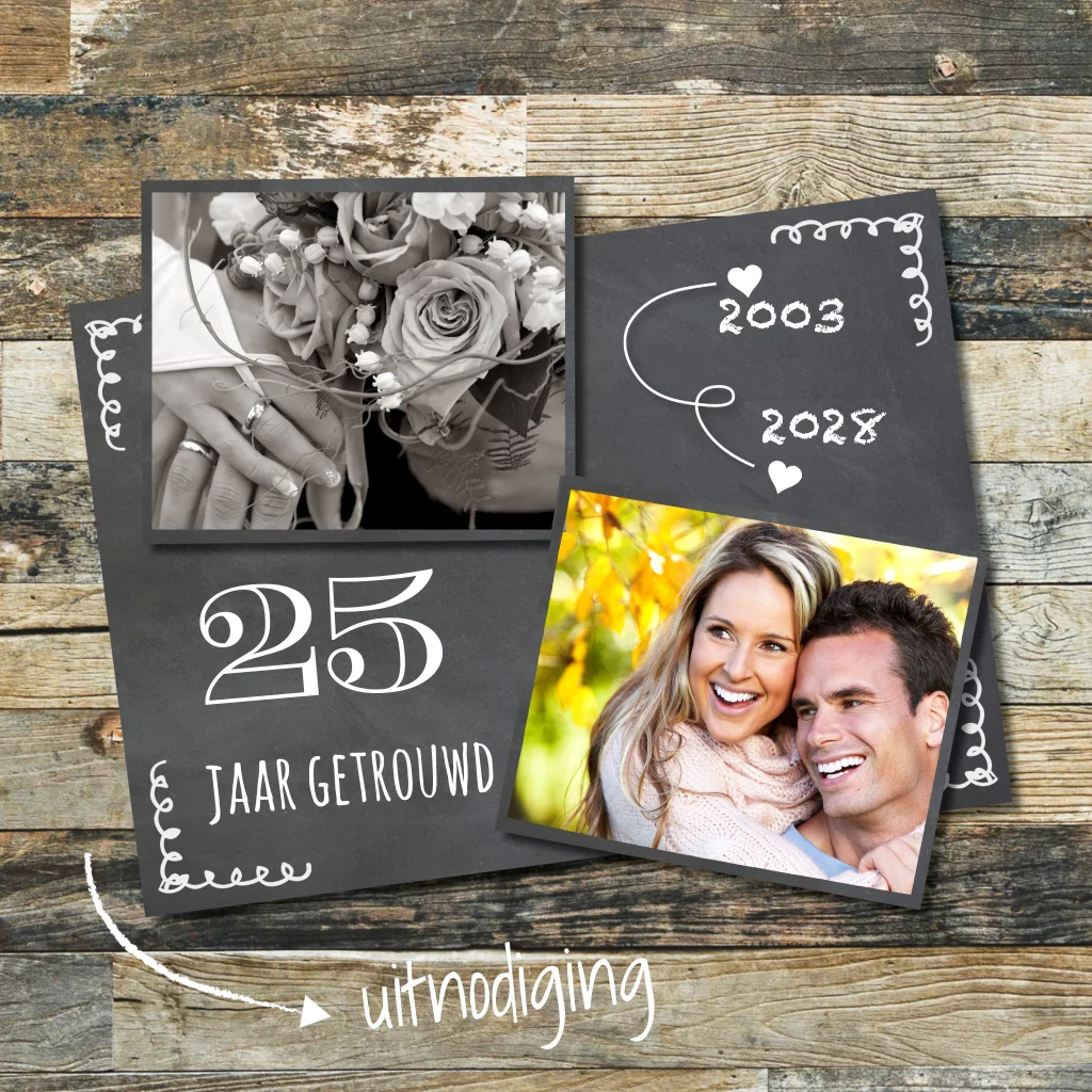 Uitnodiging 25 jarig jubileum huwelijk met foto collage. Houten achtergrond en krijtbord. (1732)
