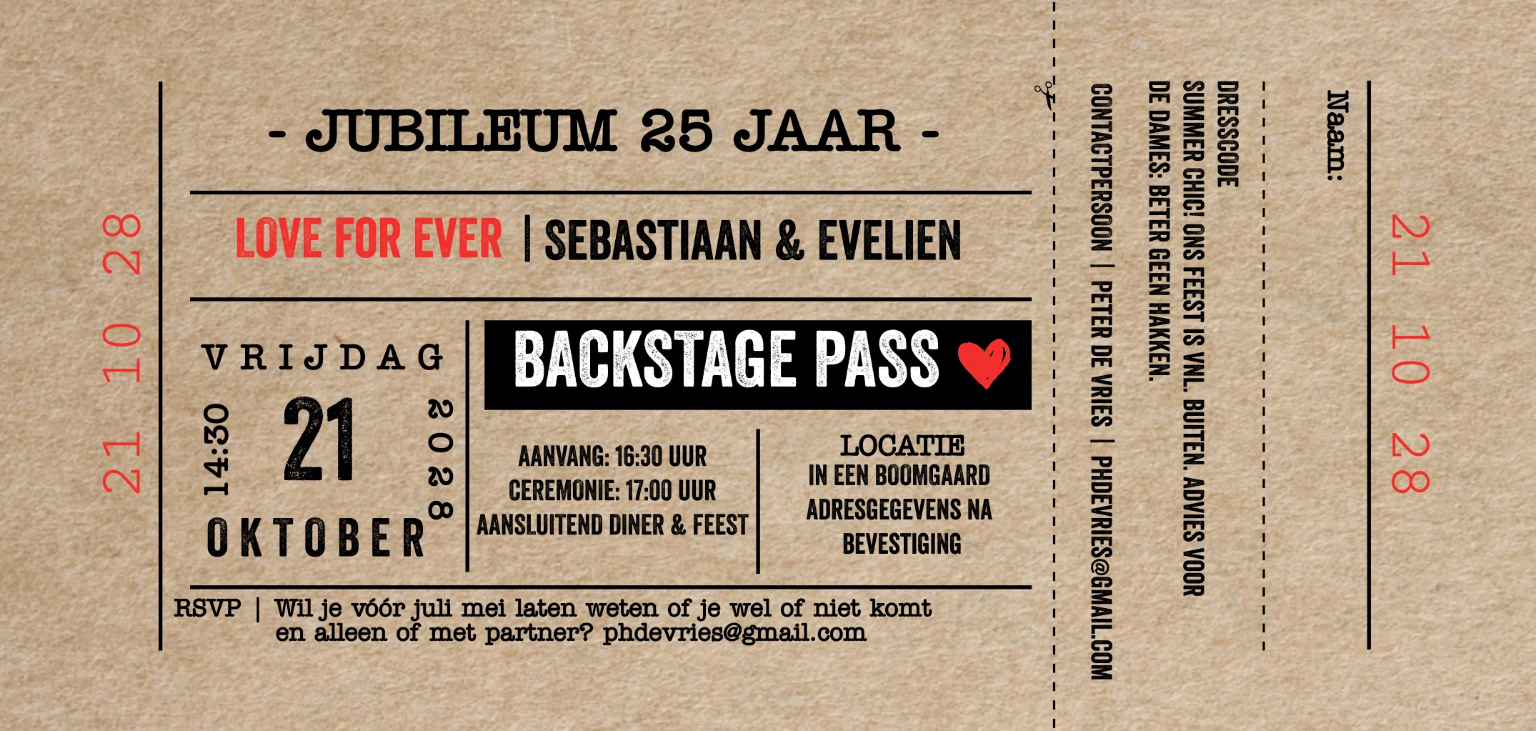 Uitnodiging 25 jarig jubileum ticket langwerpig met kraft