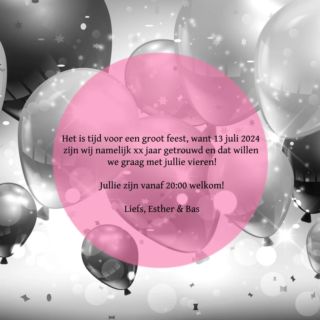 Maak deze feestelijke uitnodiging voor jullie jubileum. Met mooie zwart wit ballonnen. (7145)