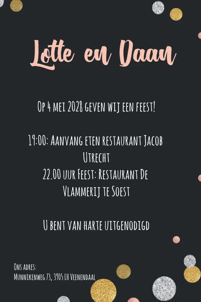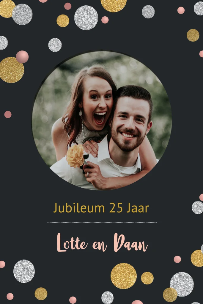 Foto Uitnodiging 25 jaar getrouwd jubileumfeestje met confetti in zilver en goud op zwart. (6338)