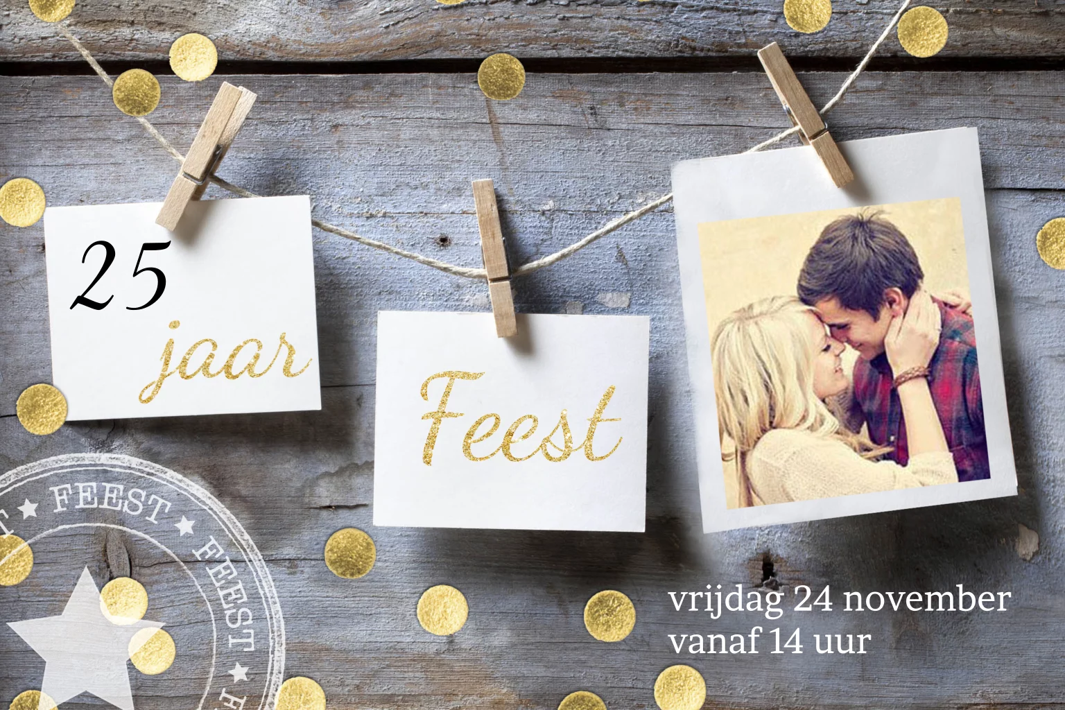 Uitnodiging 25 jarig jubileum feest met hout en gouden confetti