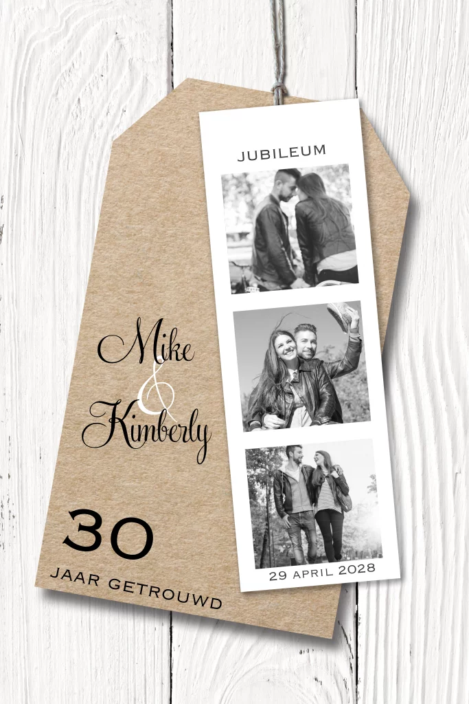 Jubileum uitnodiging 30 jaar met wit gekleurd hout en fotostrip