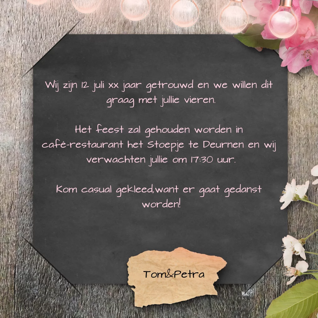 Vrolijke jubileum uitnodiging 30 jaar getrouwd met bloemen en fotostapel op een achtergrond van krijtbord en hout. (5965)