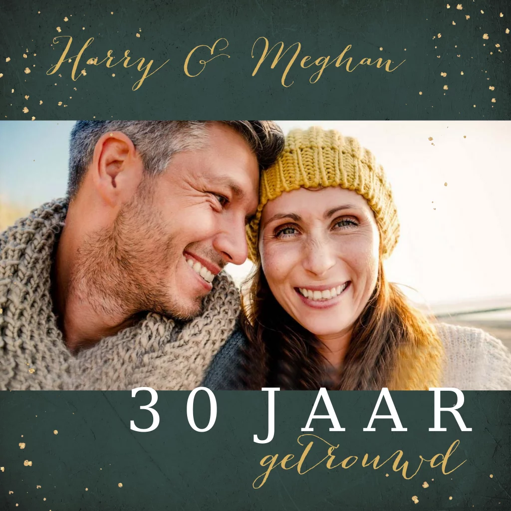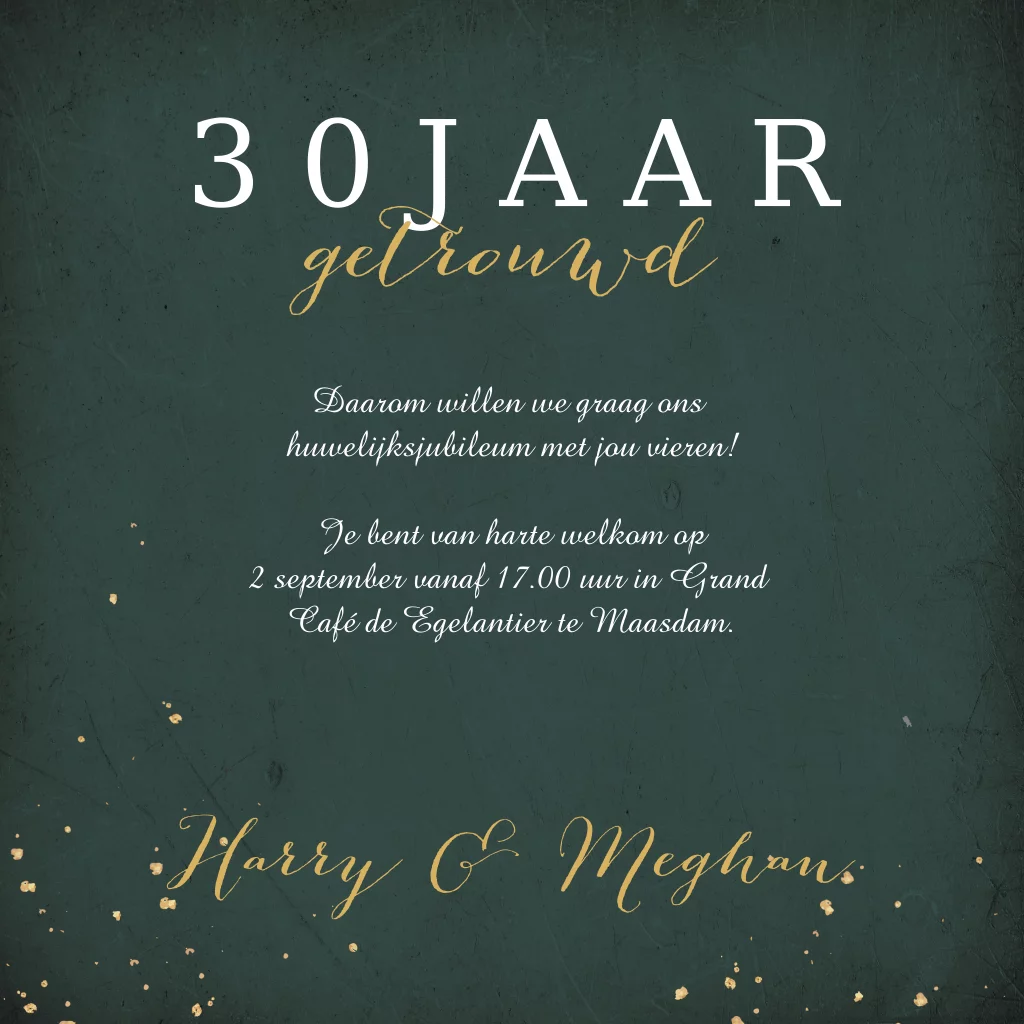 Maak deze feestelijke jubileumkaart 30 jaar getrouwd voor jullie huwelijksjubileum. Met fraaie gouden confetti en combineer het goud mooi met de groene achtergrond. (20292)