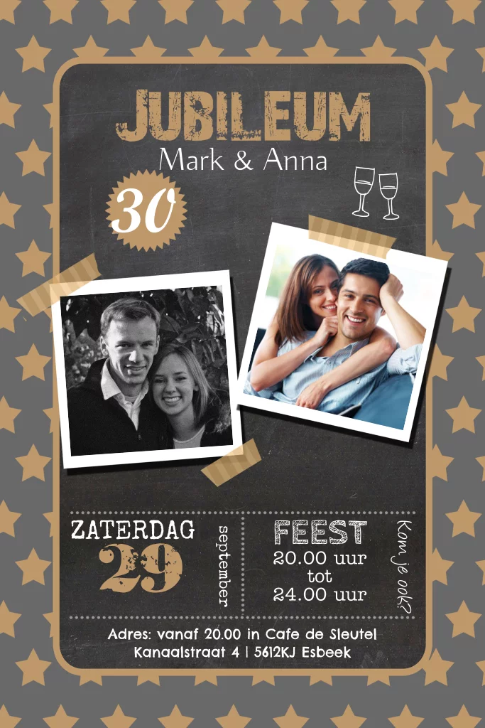 Jubileumuitnodiging 30 jaar krijtbord met typografie, sterren en foto