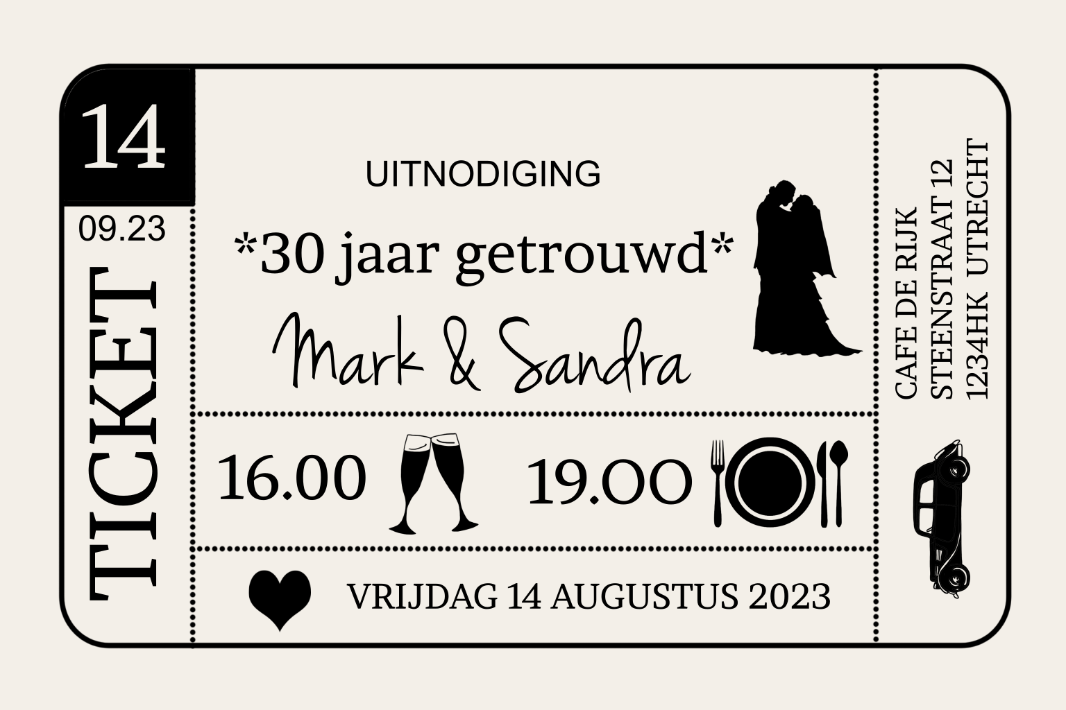 Stoere en originele jubileum uitnodiging ticket 30 jaar getrouwd met geheel aanpasbare tekst en achtergrond. (3200)