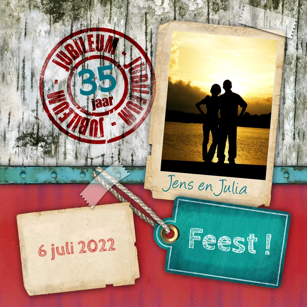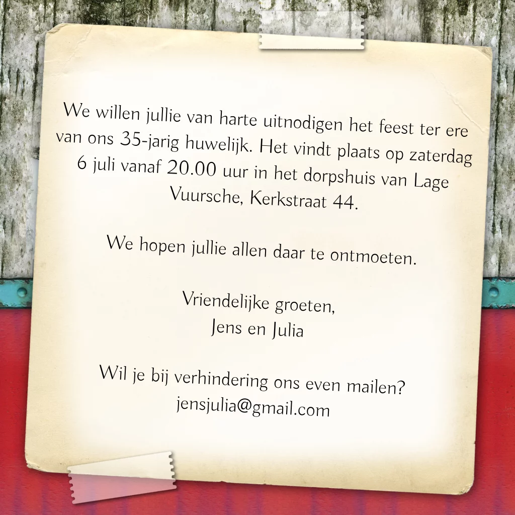 Uitnodiging voor een 35 jarig jubileum met rood en hout op de achtergrond. Groen label en jubileum stempel.