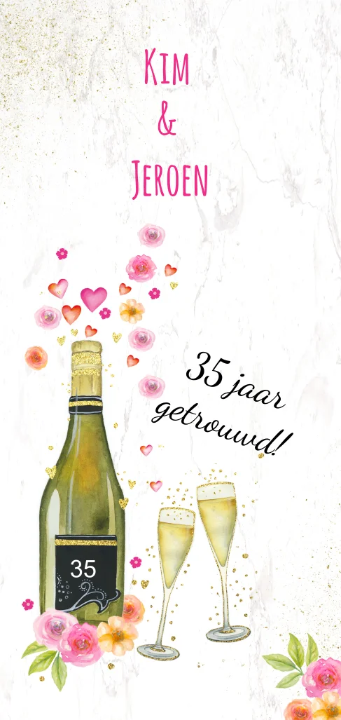 Uitnodiging 35 jarig huwelijksjubileum met champagne versierd met bloemen en hartjes in aquarel met veel goudkleurige glitter op marmer achtergrond. (6041)