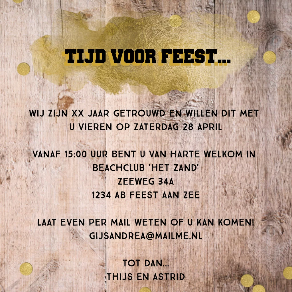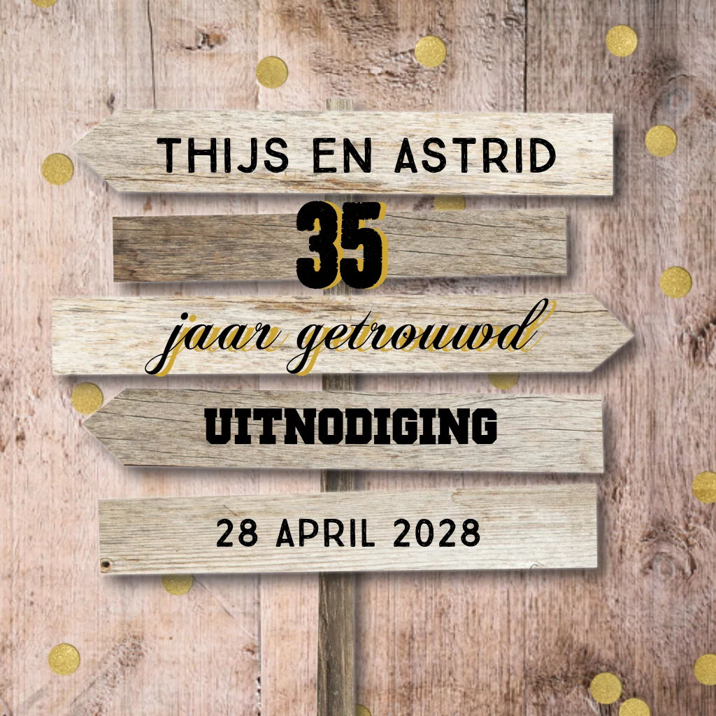 Uitnodiging 35 jarig jubileum met houten bord en confetti