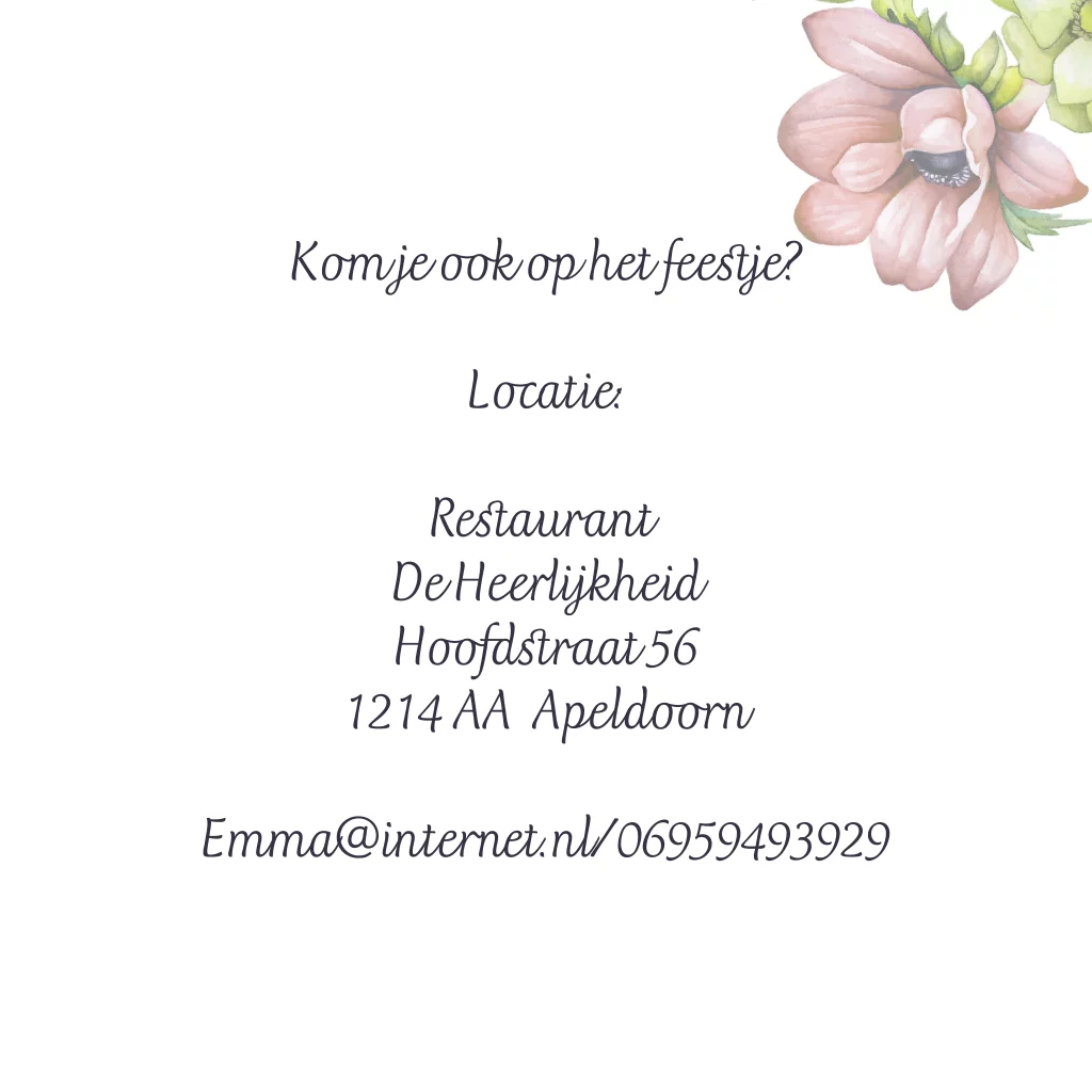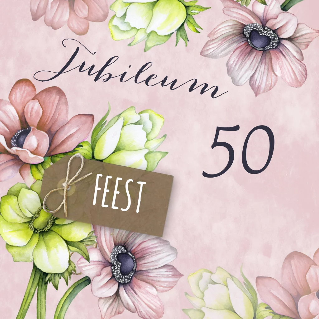 Uitnodiging voor een 50 jarig jubileum met mooie anemonen op poederroze achtergrond en leuk labeltje. (4870)