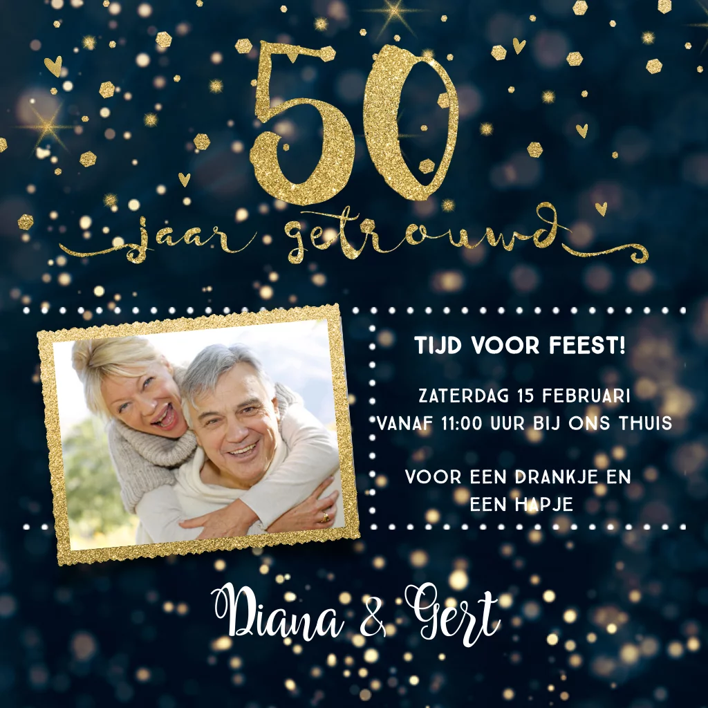50 jaar getrouwd uitnodiging met goudkleurige details en confetti. (6442) Dit is een leuke uitnodigingskaart voor een feestje met een frisse en moderne uitstraling