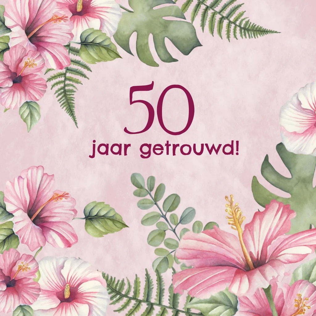 Uitnodiging voor een 50 jaar getrouwd jubileum met mooie tropische bloemen en blad in aquarel op poederroze achtergrond. (4888)