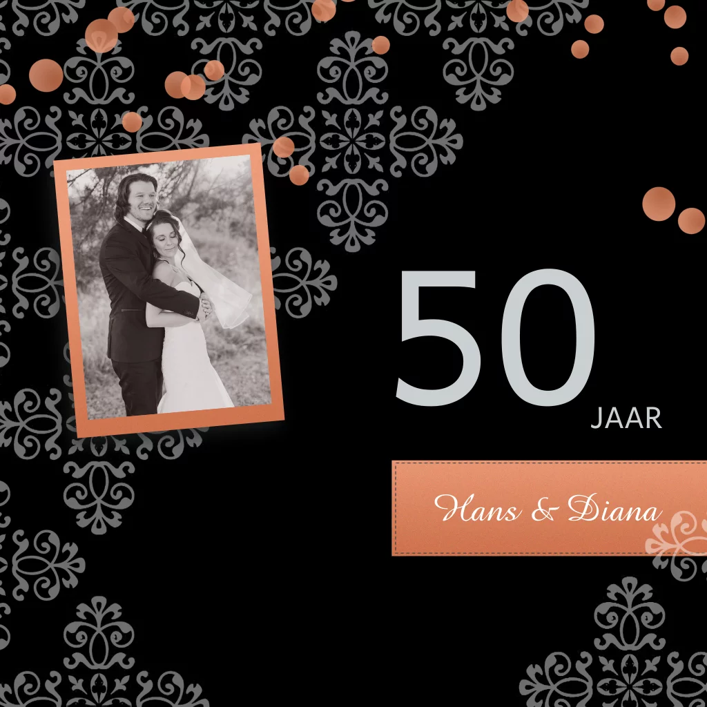 Dubbele jubileumkaart 50 met goudkleurig rosé barok look en confetti. (6881)