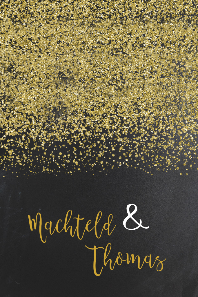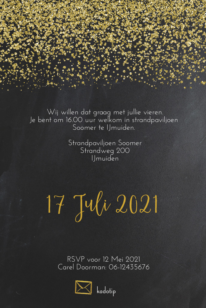 Krijtbord met goudkleurige glitters voor een smashing effect! Hoe feestelijk is deze kaart om jullie jubileum mee aan te kondigen? Dit feest kan nu al niet meer stuk. (7140)