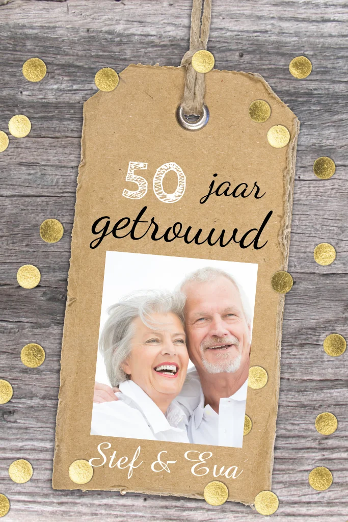 Uitnodiging 50 jarig trouwjubileum feest met hout en goudkleurige confetti. Met leuk label waarop jullie foto geplaatst wordt. (6053)