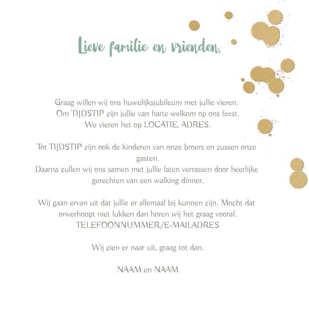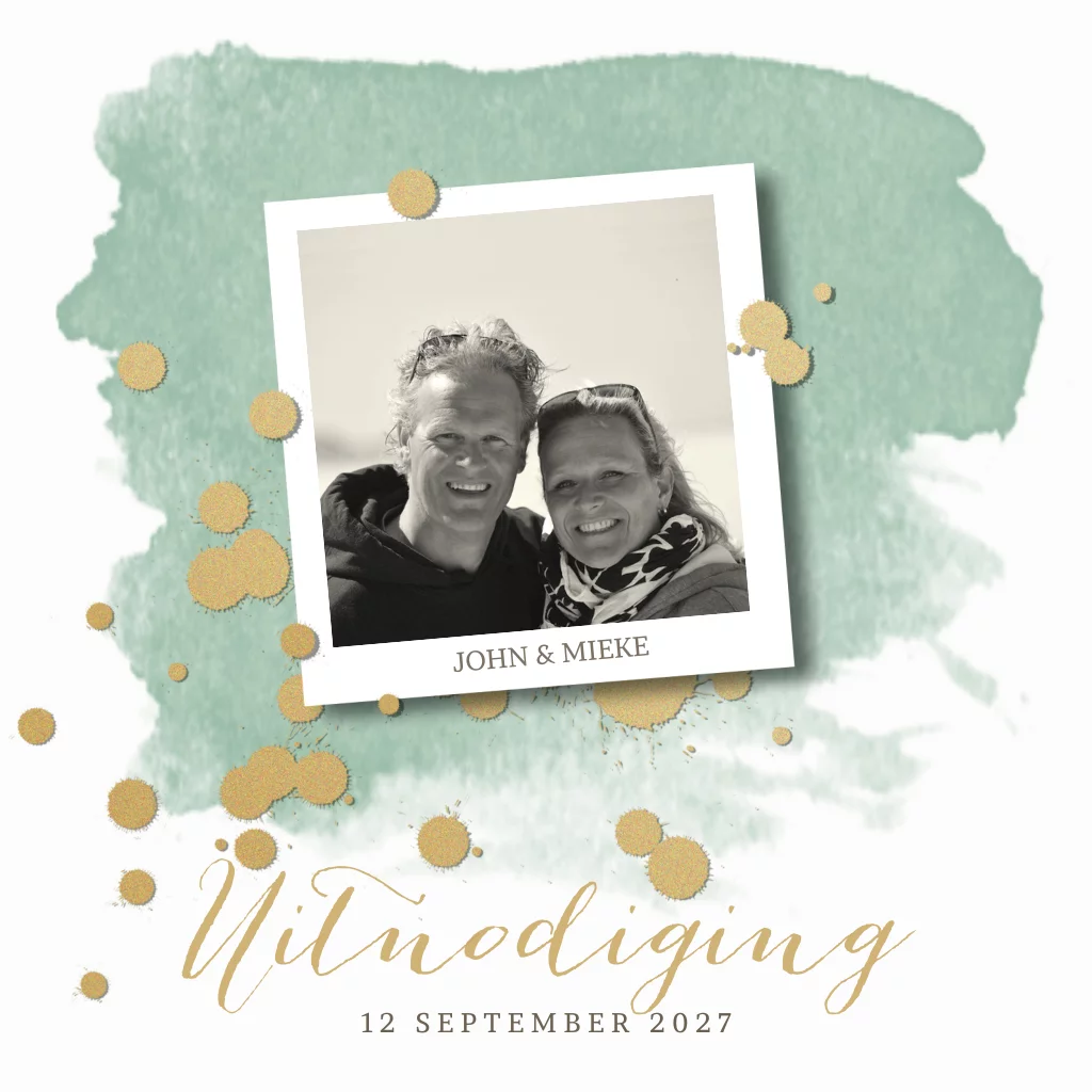 Chique huwelijksjubileum uitnodiging 50 jaar getrouwd met foto groene waterverf met goud-look confetti voor als jullie 50 jaar getrouwd zijn een feestje gaan vieren. (7358)
