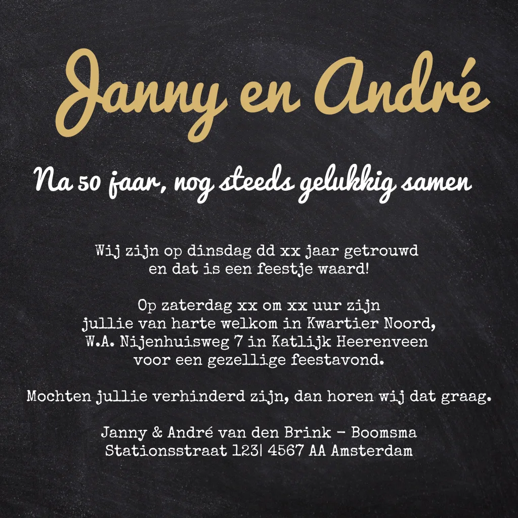 Fotokaart collage uitnodiging 50 jarig huwelijk krijtbord en hart