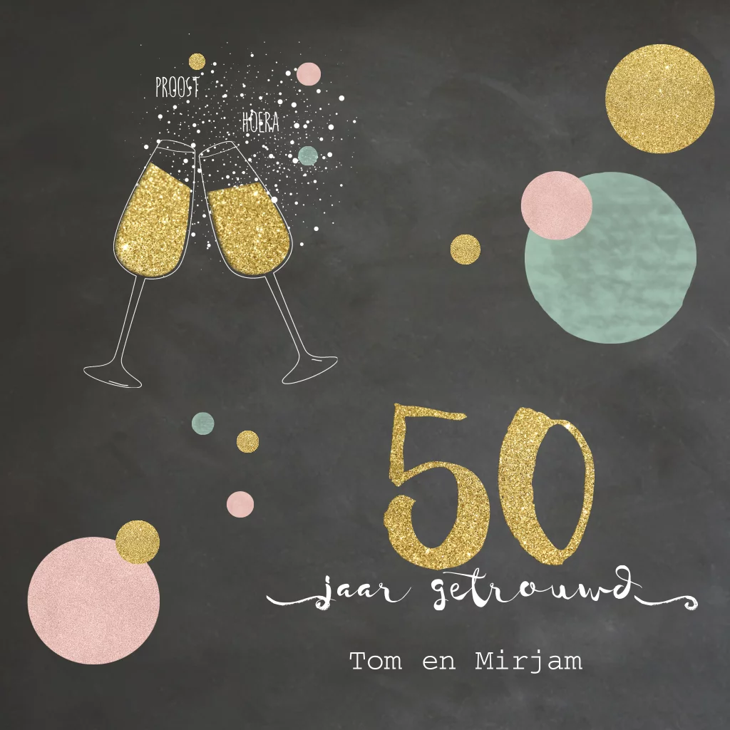 Uitnodiging 50 jaar champagne glazen met goud glitter pastel