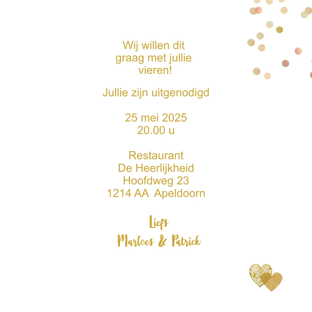 Gouden huwelijksjubileum uitnodiging 50 jaar getrouwd met goudkleurige harten en confetti. (8307)