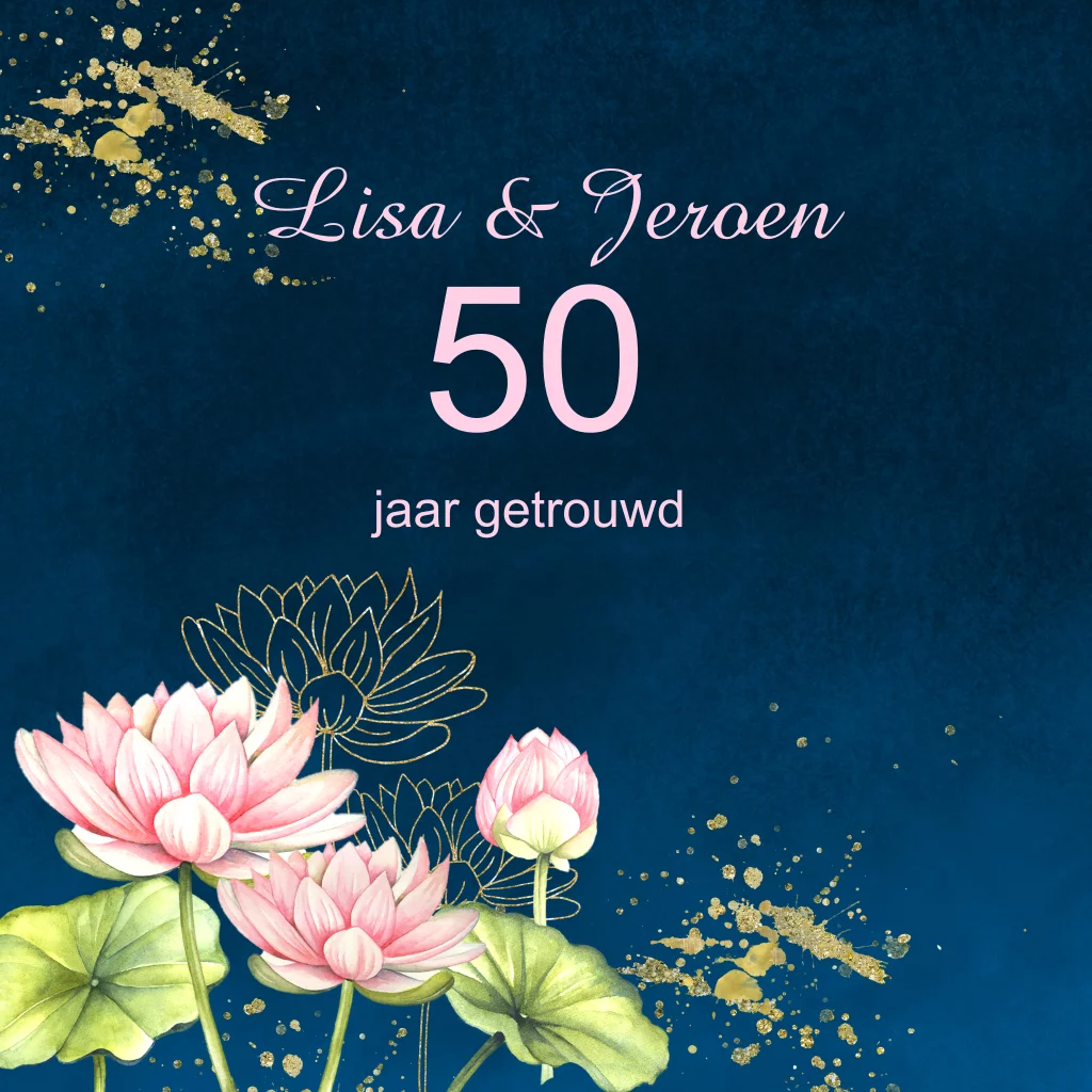 50 jarig huwelijksjubileum met lotusbloemen in aquarel op diepblauwe achtergrond versierd met goudkleurige glitter. (8401)