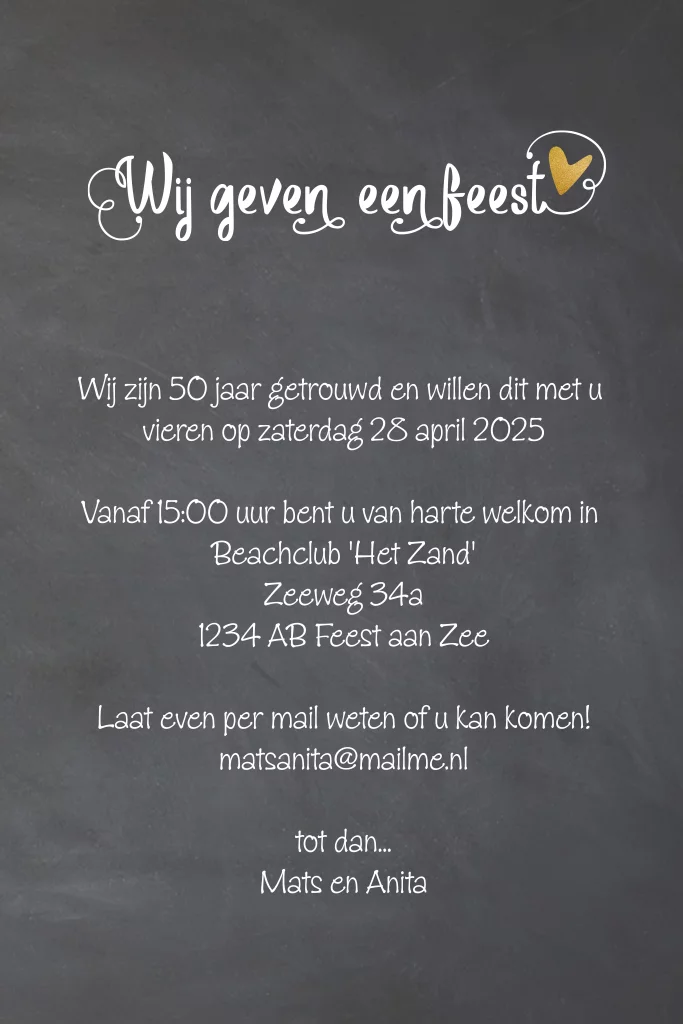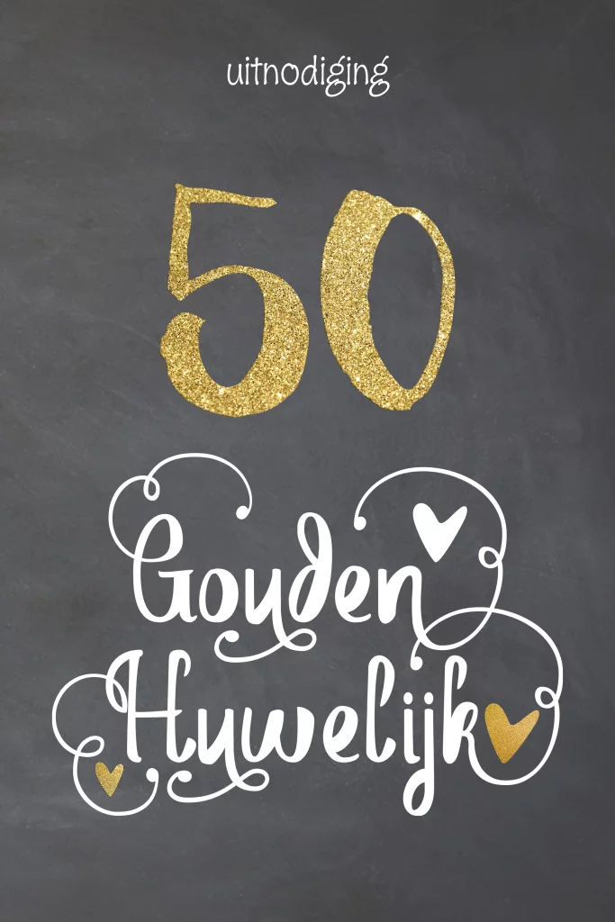 Jubilea uitnodigingskaart met goudkleurig jaartal 50 op krijtbord. uitnodiging gouden huwelijk 50 jaar getrouwd. (5277)