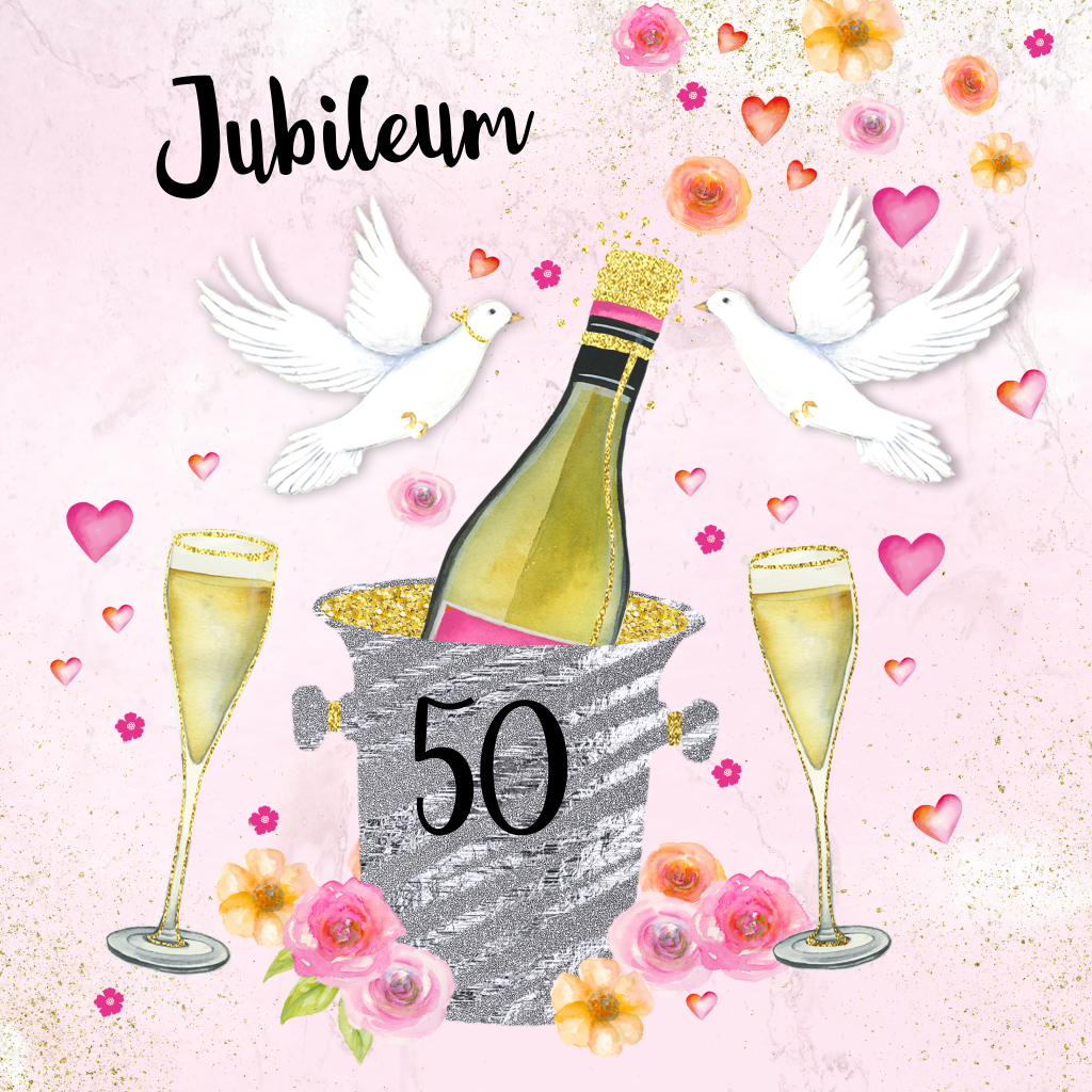 Uitnodiging voor een 50 jarig jubileum met champagnekoeler en duiven versierd met bloemen in aquarel en veel glitter in goud-look en zilver-look.