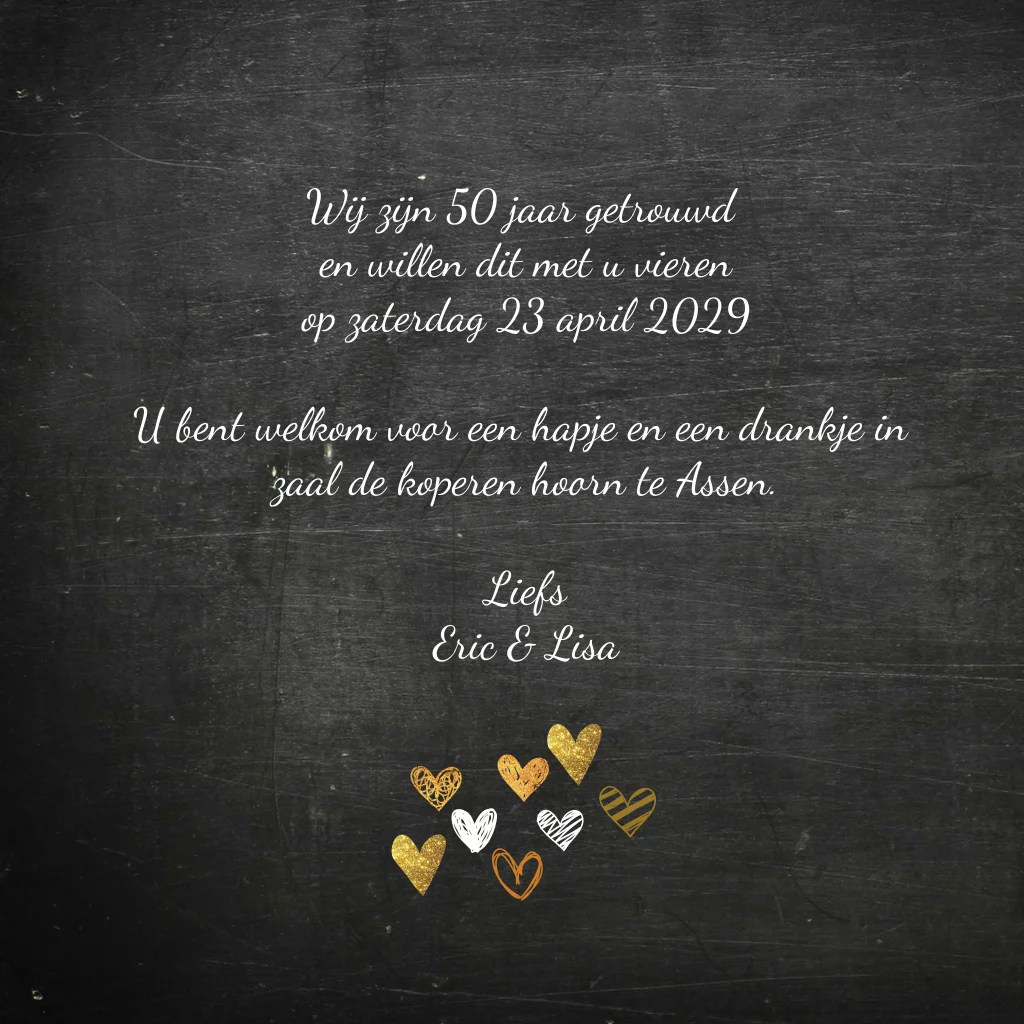 Maak deze feestelijke uitnodiging met goudkleur voor jullie 50 jarig jubileum. Plaats een eigen trouwfoto van vroeger en maak hem helemaal van jullie! (6911)