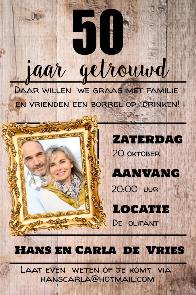 Uitnodiging voor een 50 jarig jubileum met hout en fotolijst