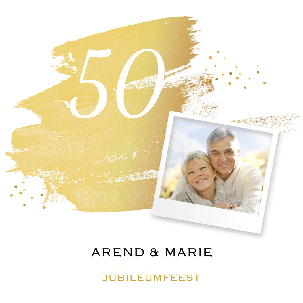 Jubileum uitnodiging 50 jaar goud tinten confetti streep en foto