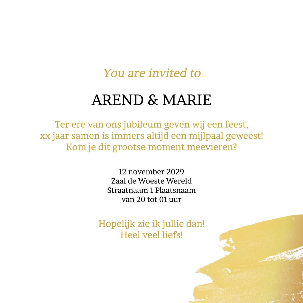 Jubileum uitnodiging 50 jaar getrouwd goudkleurige tinten confetti met waterverfstreep en foto. (7457)