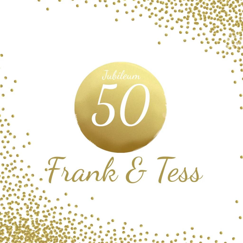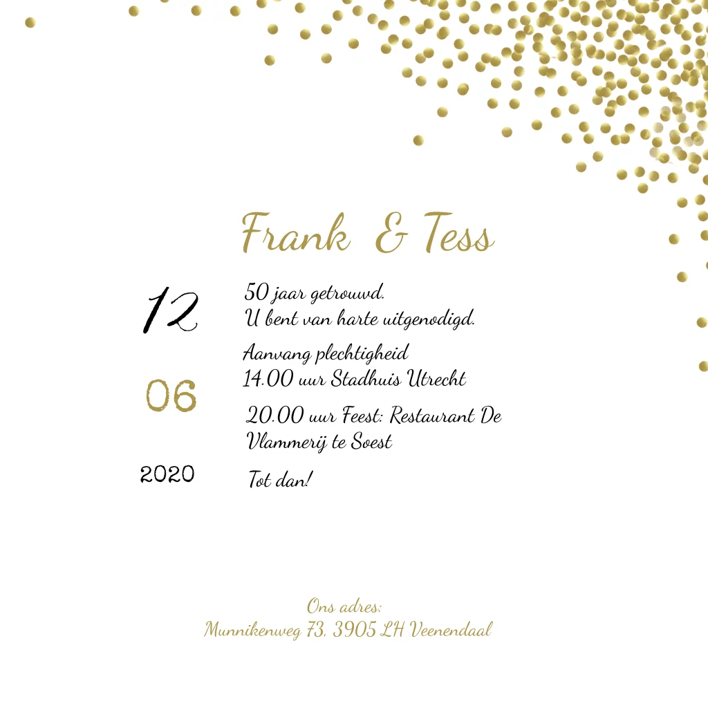 Gouden jubileumkaart 50 jaar getrouwd met goudkleurige bol en goudkleurige confetti. (4966)
