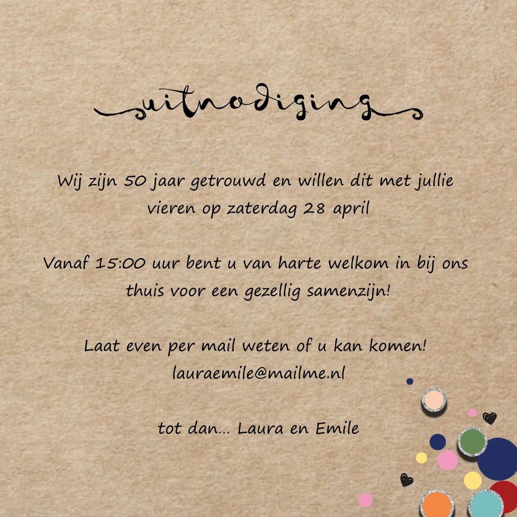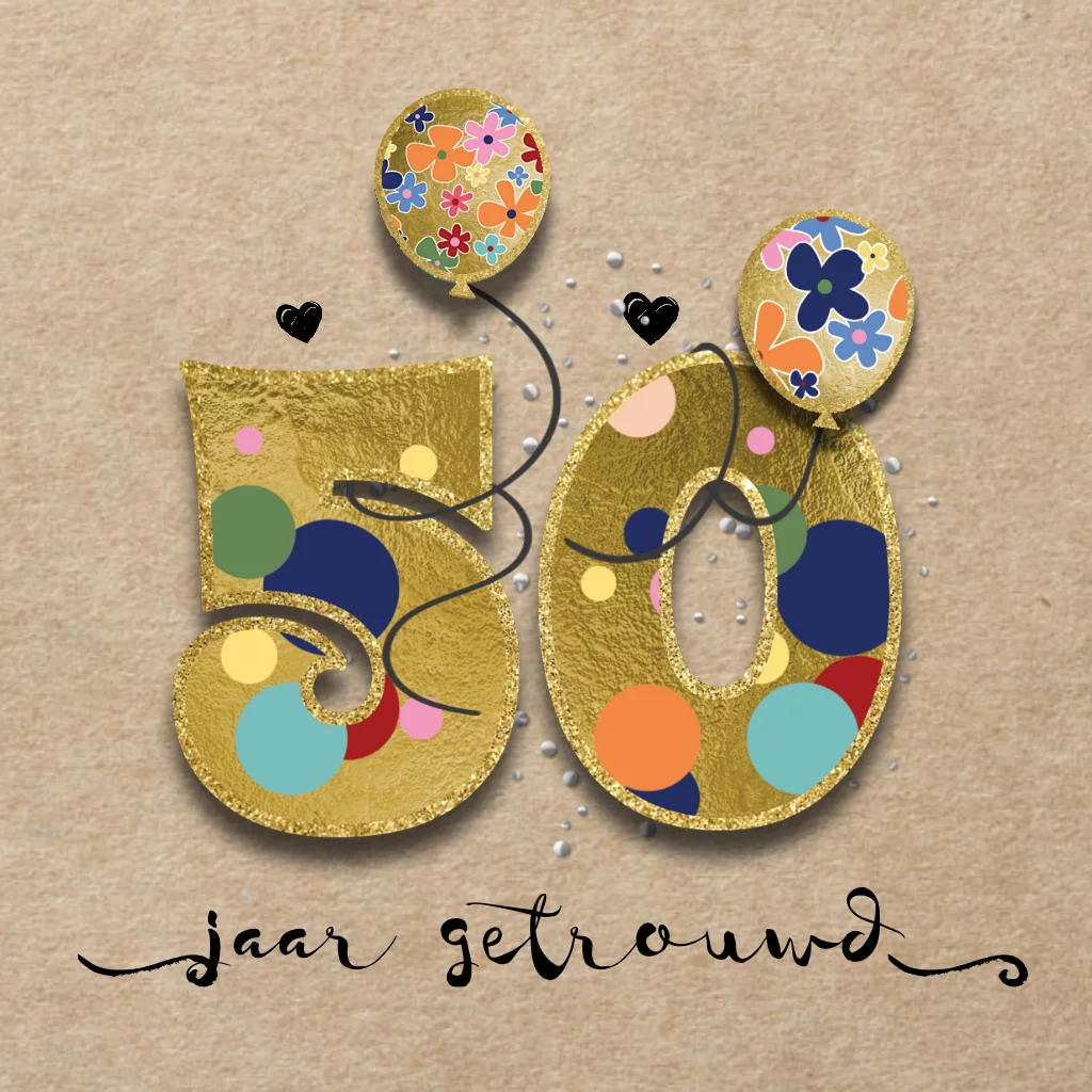 Hippe jubileum uitnodiging 50 jaar getrouwd ballonnen. (6432) Wil je een ander jaartal in dezelfde stijl, neem dan contact met ons op, je kunt dit helaas niet zelf aanpassen of je moet een 'gewone' tekst plaatsen.