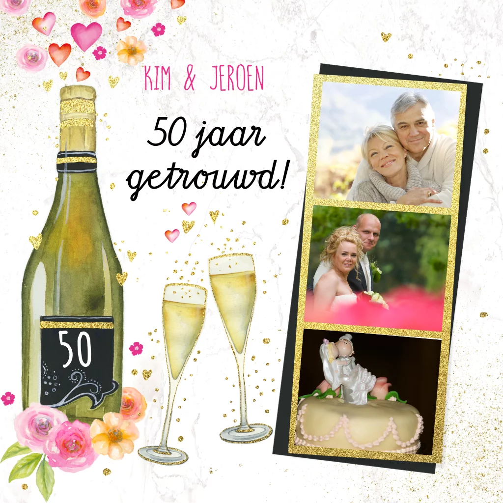 Uitnodiging 50 jaar getrouwd feest champagne versierd met bloemen en hartjes in aquarel en veel goudkleurige glitter. (6040)