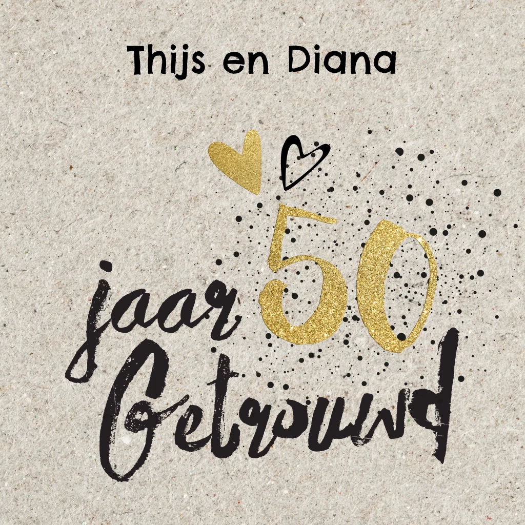 Hippe uitnodiging 50 jaar getrouwd op kraft-look papier. Met mooie goud-look elementen en verfspatten. (5245)
