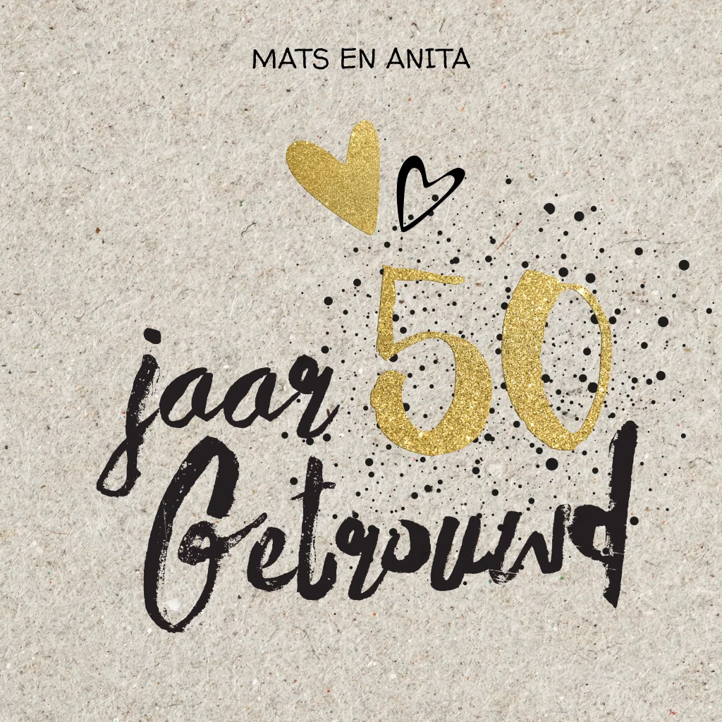 Leuke uitnodiging 50 jaar getrouwd op kraft. Met mooie goud-look elementen en verfspatten. (5245) Wil je een ander jaartal in dezelfde stijl op de kaart? Kijk bij afbeeldingen > cijfers of neem contact met ons mee. We zetten dit gratis voor je om.
