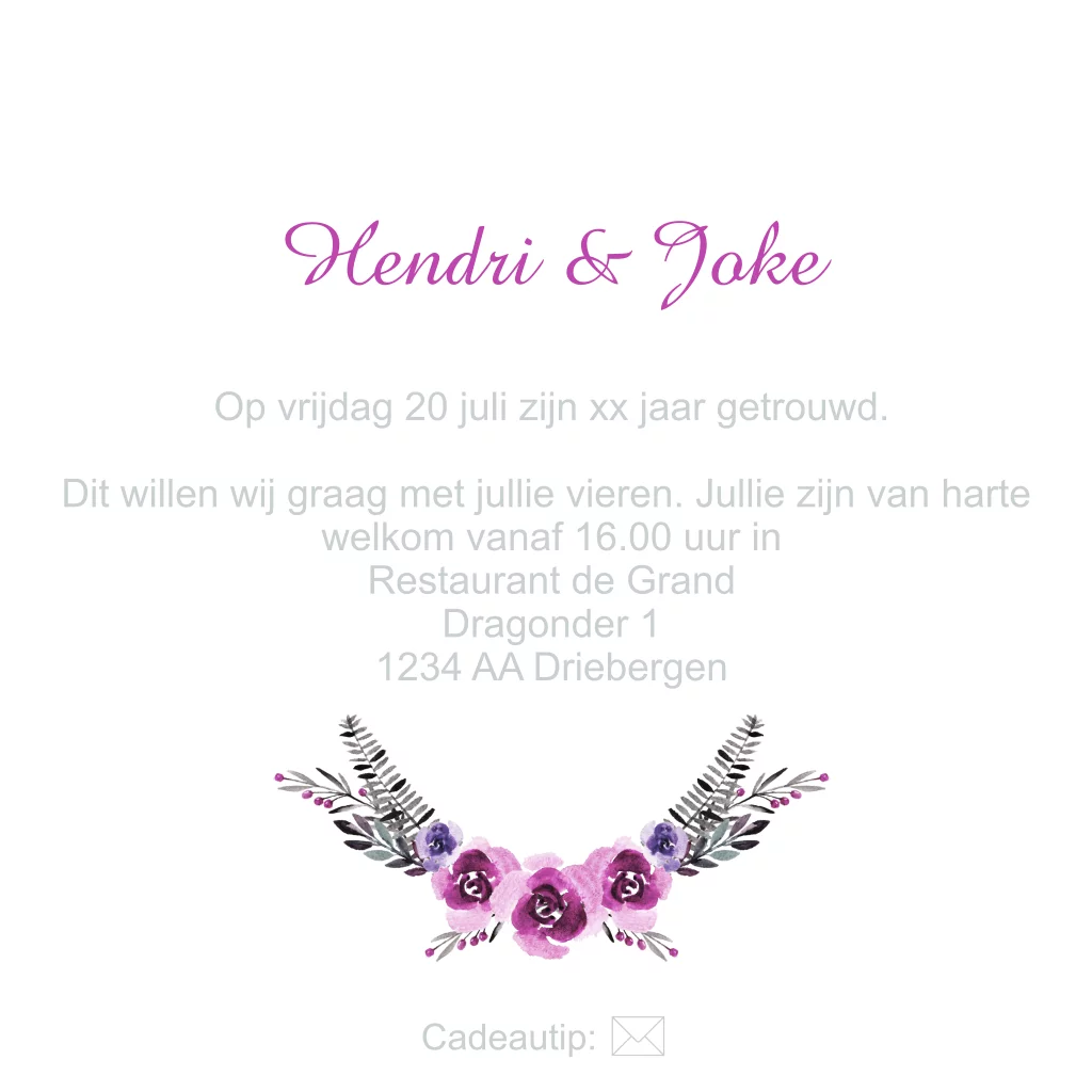 Trendy jubileum uitnodiging 50 jaar getrouwd met krans van waterverf bloemen in grijze, roze en paarse tinten. (3177)