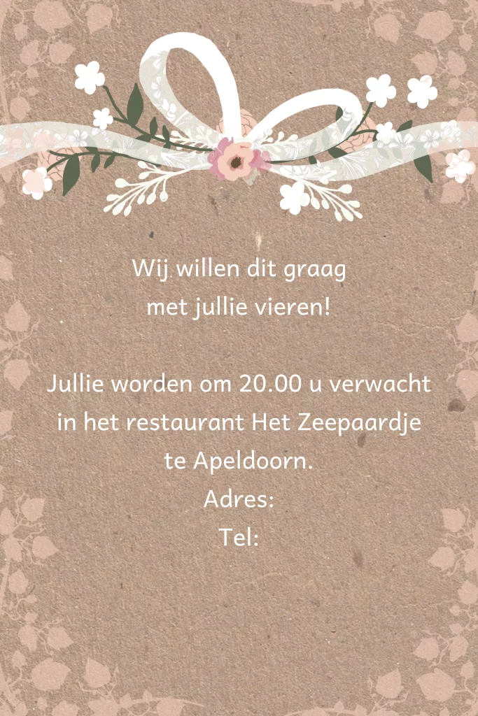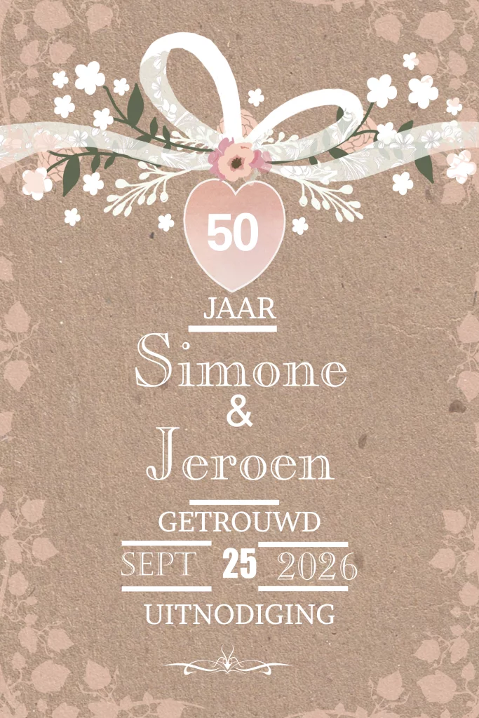 Klassieke uitnodiging 50 jarig getrouwd 50 jarig huwelijk witte bloemetjes. Sierlijke strik. (859)
