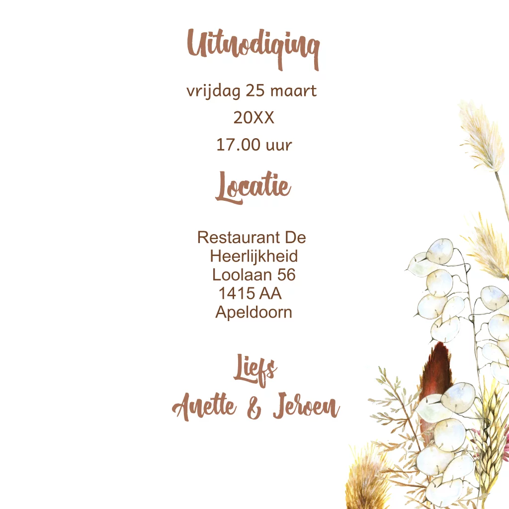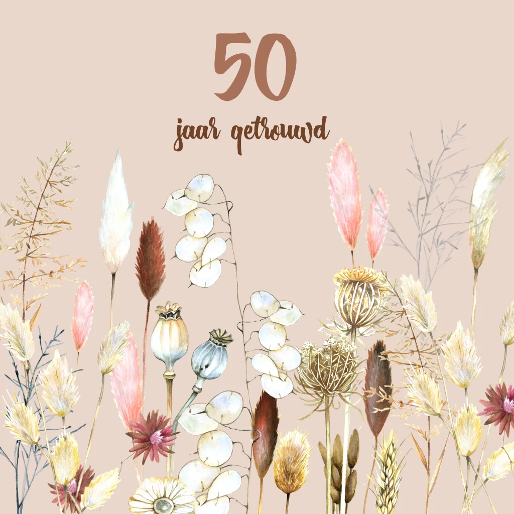 Uitnodiging huwelijksjubileum feest 50 jaar getrouwd met mooie droogbloemen en pampagras. (20462)