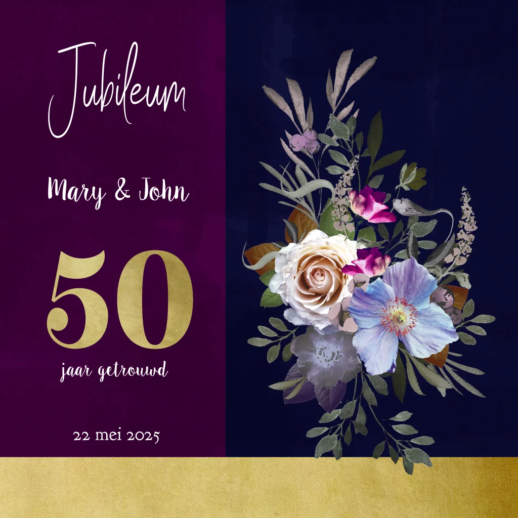 Prachtige uitnodiging voor 50 jarig huwelijk. Binnenzijde heeft ook een mooi fotokader, maar kan ook zonder foto gebruikt worden. De kaart heeft donker paarse tinten met goudkleurige details en een bloemen boeket. (21429)