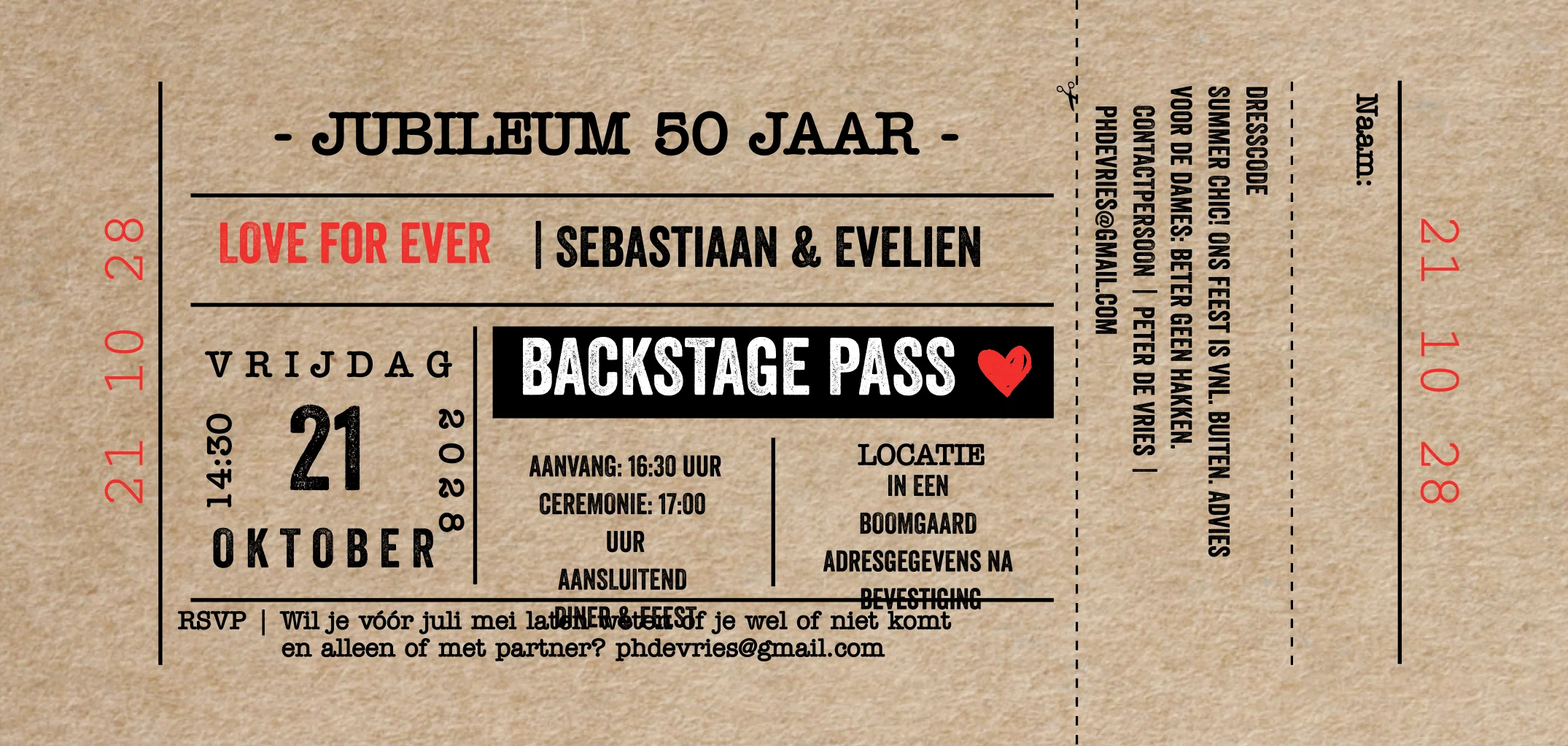 Uitnodiging 50 jarig jubileum ticket langwerpig met kraft