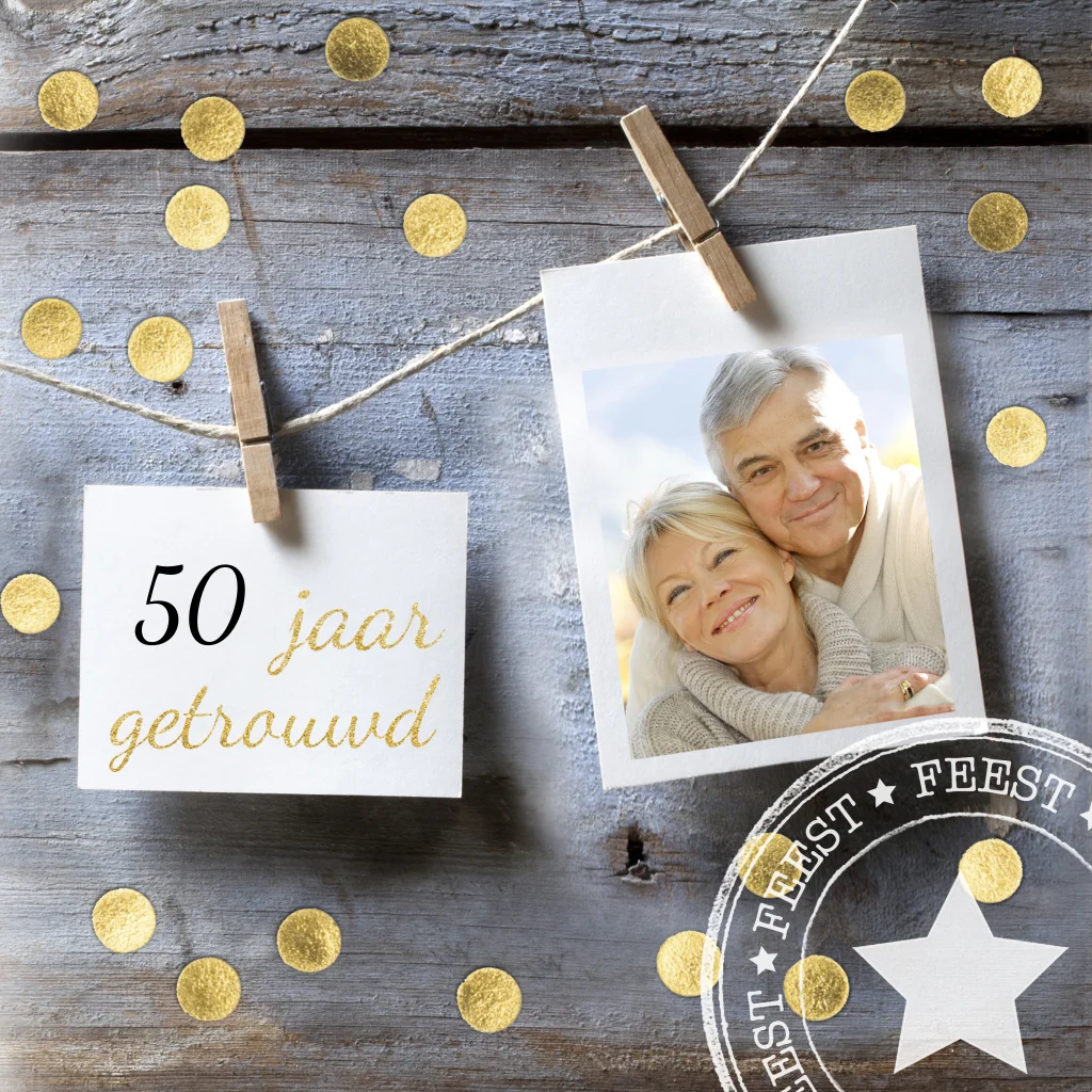 Uitnodiging 50 jarig jubileum feest met foto en gouden confetti