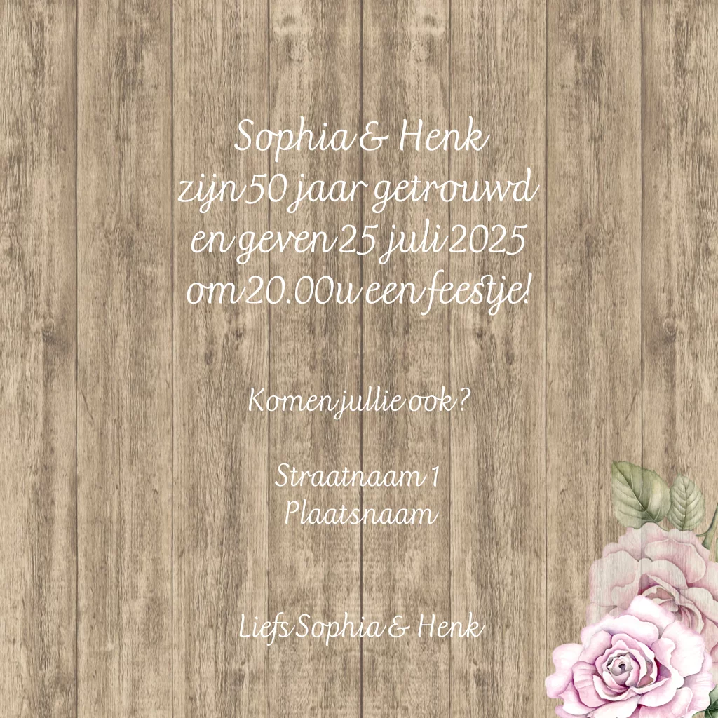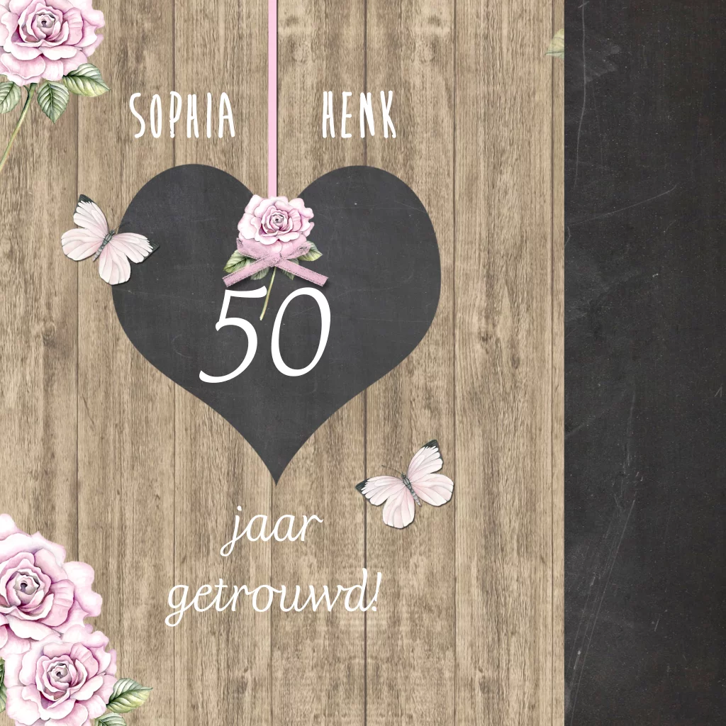 Uitnodiging jubileum 50 jaar getrouwd met hart als krijtbord versierd met rozen en lint op houtprint. (3711)